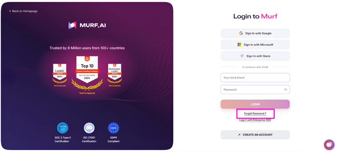 If you encounter any issues receiving the password reset link, please contact our support team via email (support@murf.ai) or live chat for further assistance