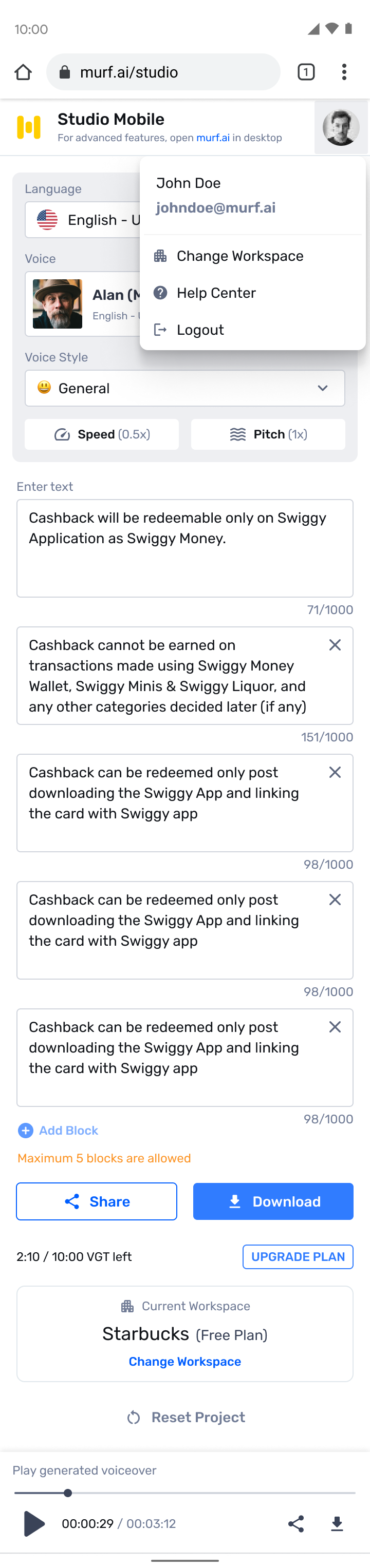 Preview and Share: Get a preview of your voiceovers and share them with others.
