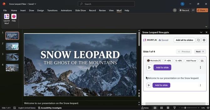 Murf voices are now available in PowerPoint via our plugin, enabling you to instantly add narration to your presentations by converting your speaker notes to speech or by creating voiceovers from new text.