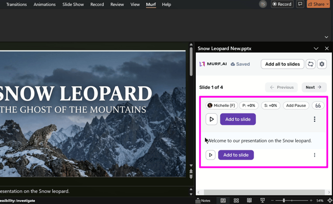 Murf's PowerPoint Plugin lets you seamlessly create narration speech from the speaker notes or on the fly.